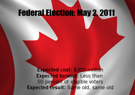 The 2011 Canadian federal election will likely go down as the most unpopular in history in terms of percentage of voter turnout. In fact, it’s a given that less Canadians will cast a vote for representation in Parliament than will have watched some part of the Royal Wedding three days earlier.
