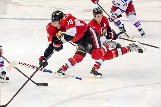Jim O’Brien of the Ottawa Senators goes head over heels during a game against the New York Rangers. (Adrian Brijbassi photo)