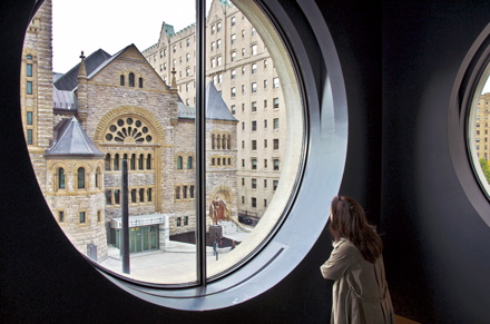 A view of the Paviliion of Quebec and Canadian Art seen from inside the Jean-Noël Desmarais Pavilion across the street. ©Julia Pelish Photography